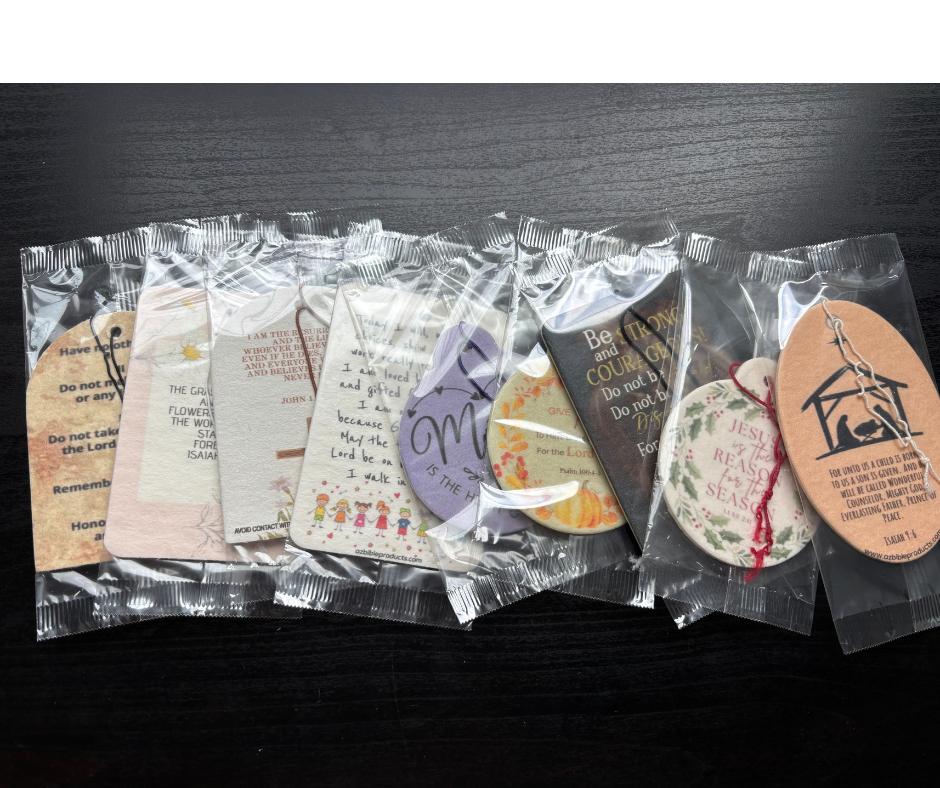 Our air fresheners are more than just a way to keep your car smelling fresh — they’re daily reminders of God’s Word. Each one carries Scripture or a message of encouragement, turning every drive into a moment of peace and reflection.