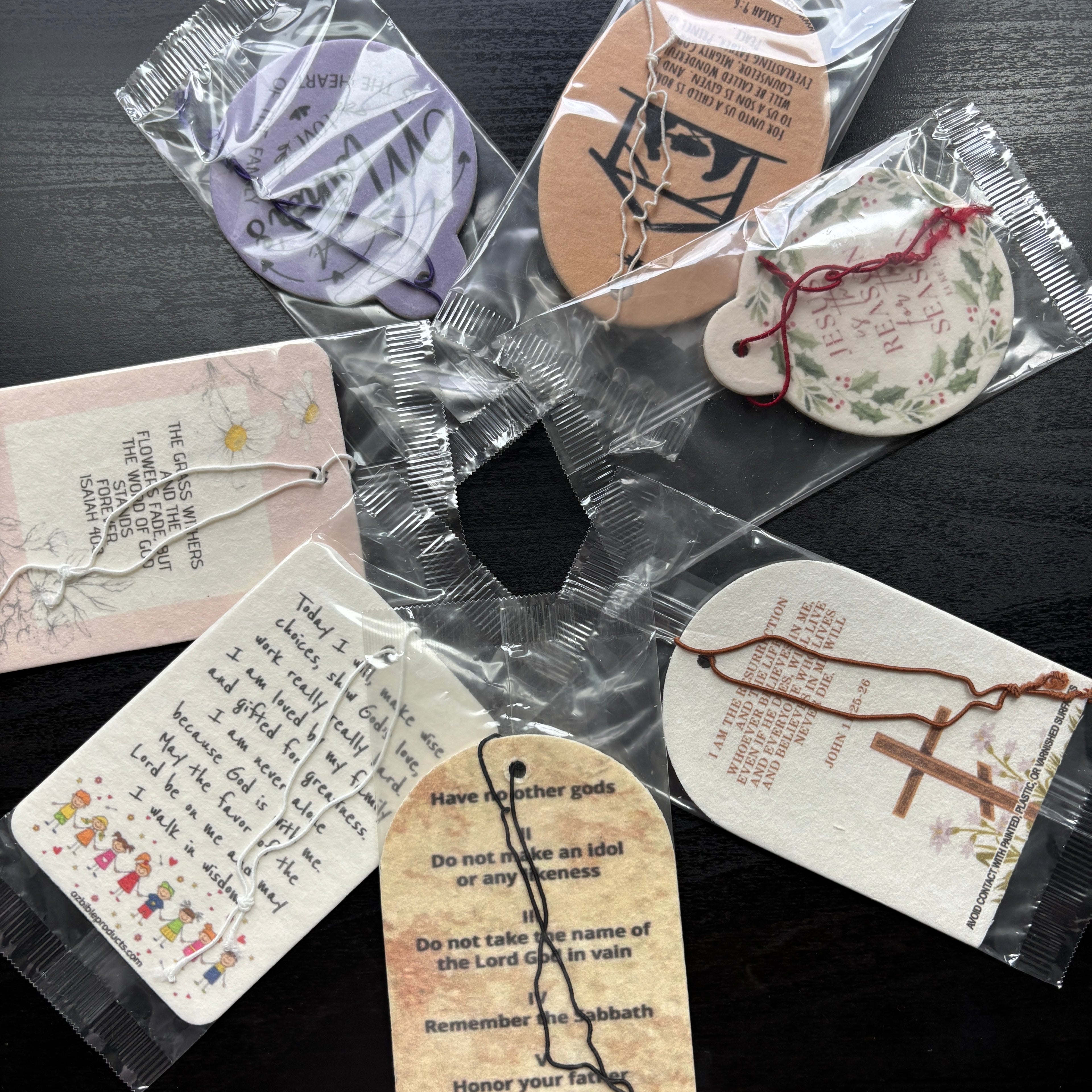 Our air fresheners are more than just a way to keep your car smelling fresh — they’re daily reminders of God’s Word. Each one carries Scripture or a message of encouragement, turning every drive into a moment of peace and reflection.